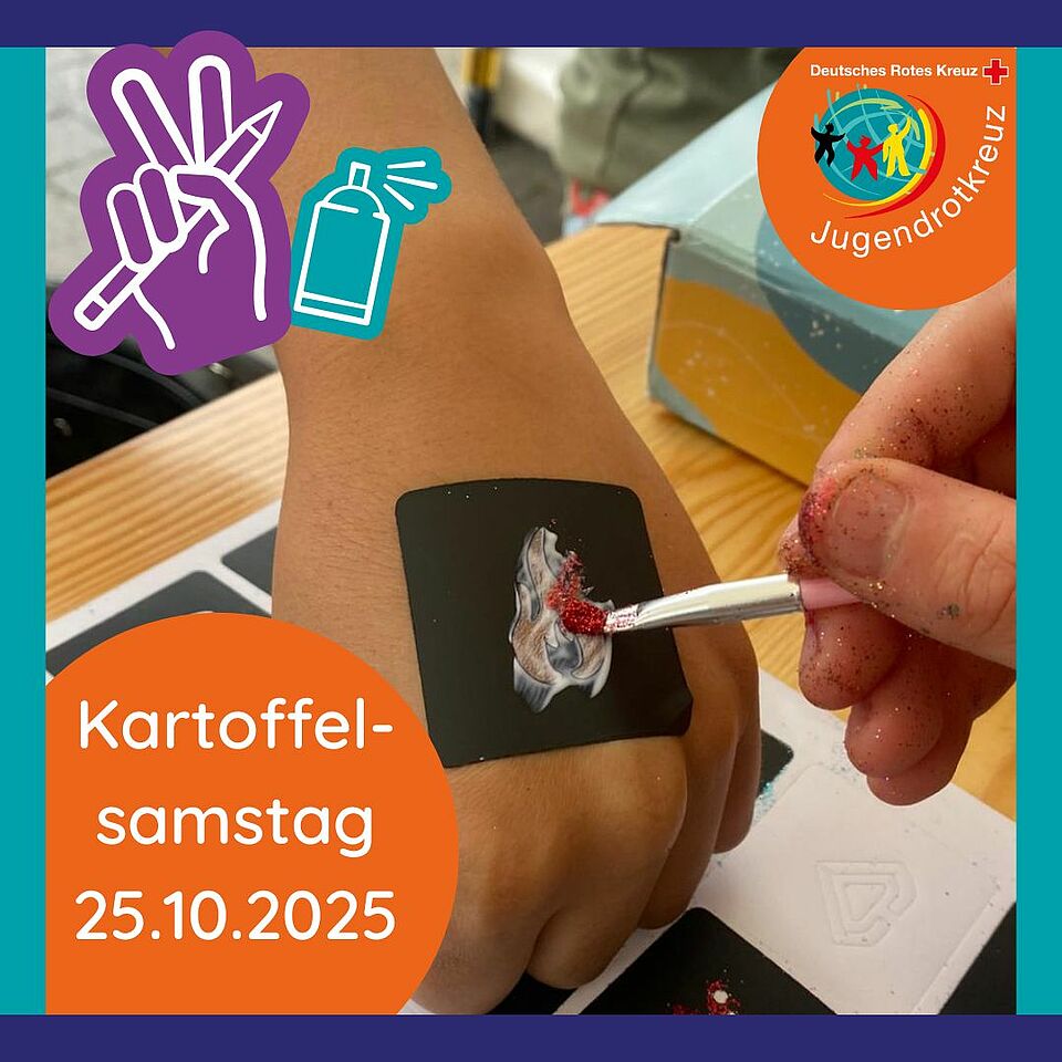 Am Kartoffelsamstag hat das JRK Herbern die Talstraße mit einem bunten Stand zum strahlen gebracht. Dort drehte es sich um glitzernde Tattoos und kreative Ausmalbilder. Kinder und Erwachsene konnten sich aus vielen großen und kleinen Motiven ihr Lieblingsmotiv aussuchen, dass dann mit hautfreundlichen Kleber und jeder Menge Glitzer auf die Haut gezaubert wurde.